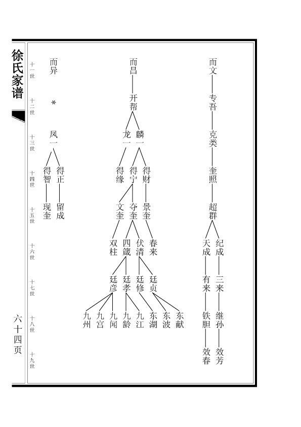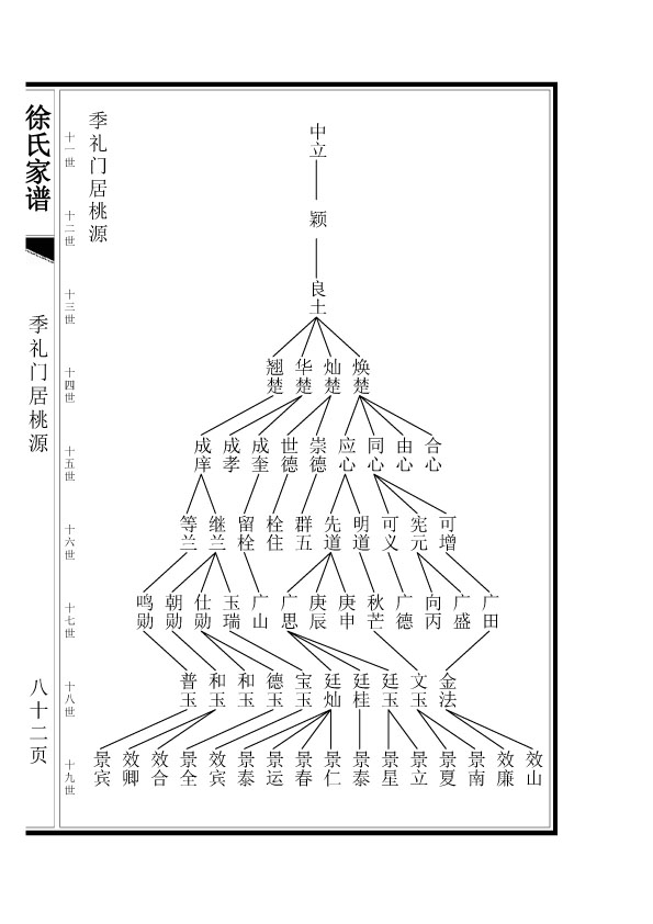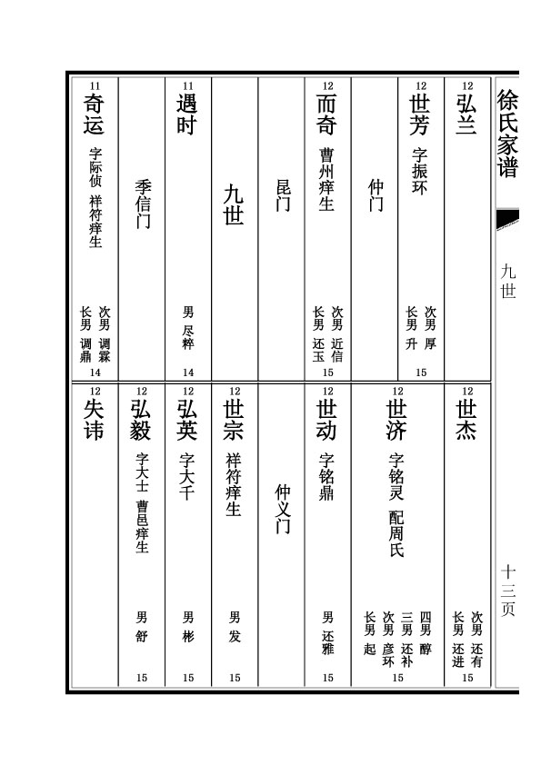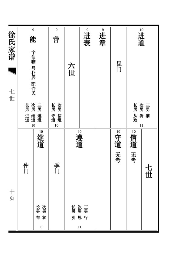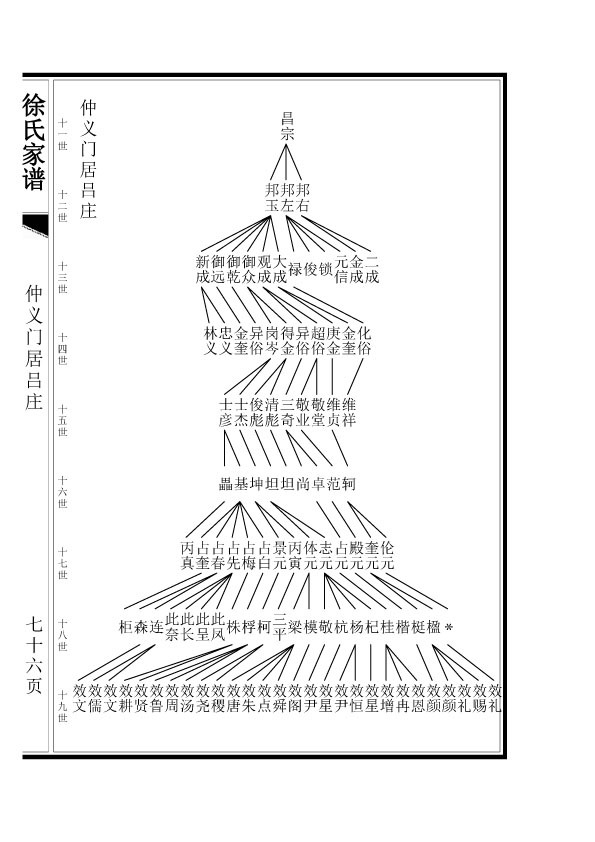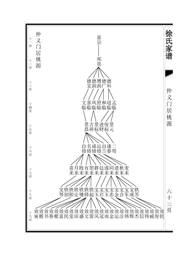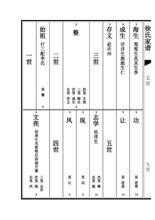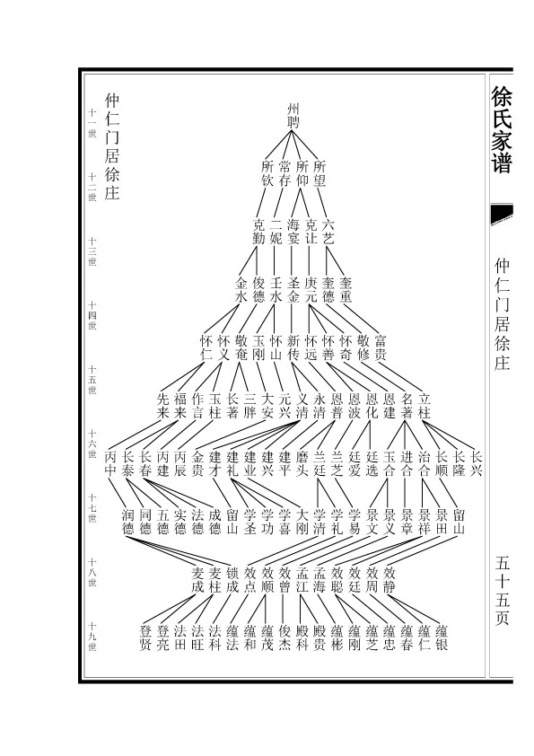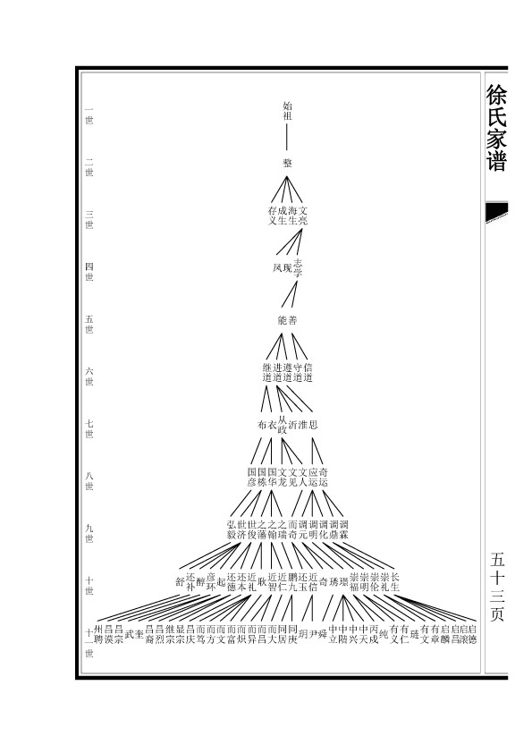 按族谱序言所载,“始祖失讳,行三(这种情况在北方较为常见), 奉大明洪武钦命自山西太原汾州迁居此逾六百余载……”。族谱内容较为 简单。格式世系与行传配合,行传样式为每页分上下两行,每行九列,每人占一格,上列名讳,中载配氏,下列生子情况。超两个儿子的占两格。世系按他们讲叫“世脉”,为宝塔图,层数五到九层不等。两种格式都加链接页码,父子链接,世系与行传链接,便于查找。
