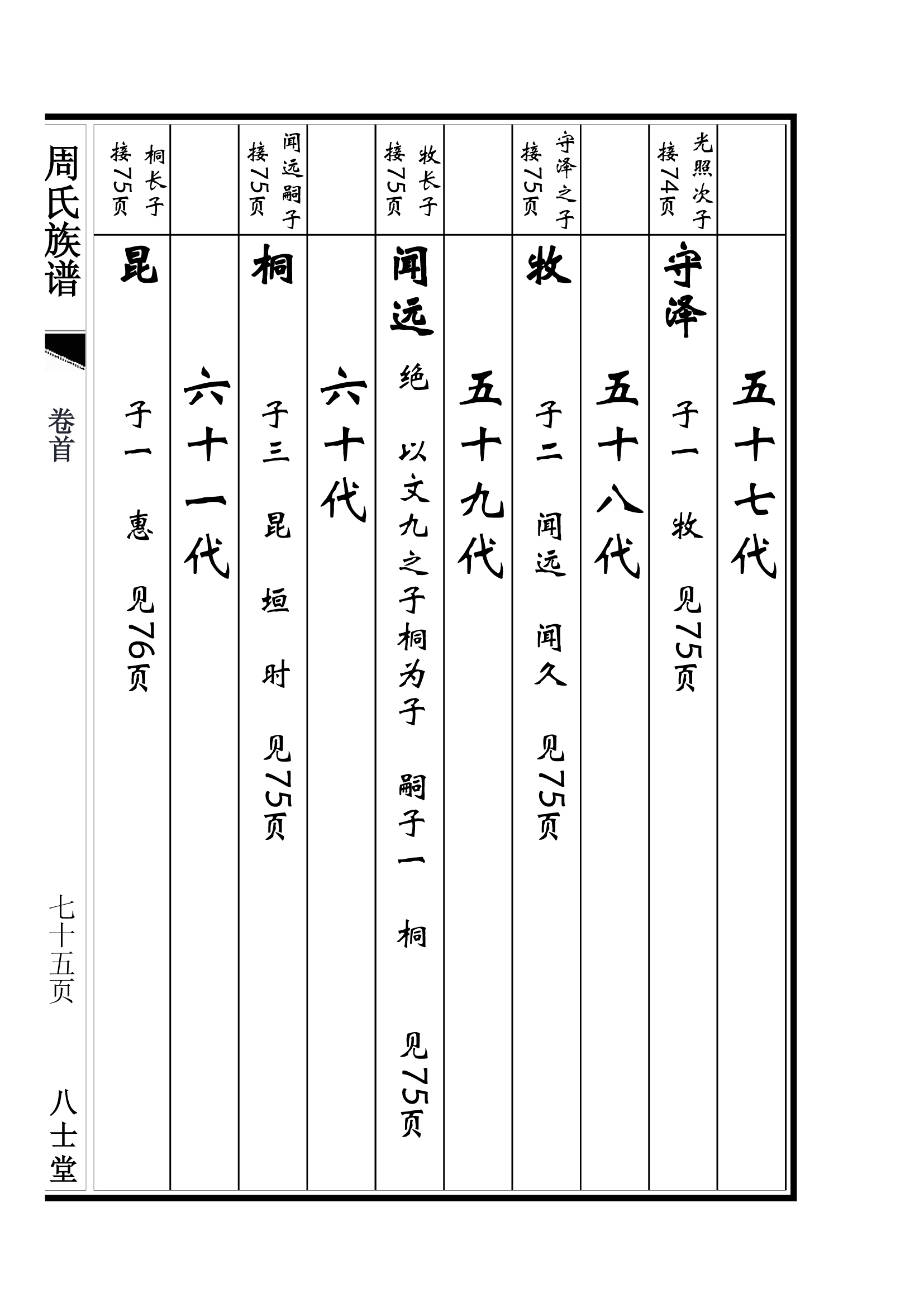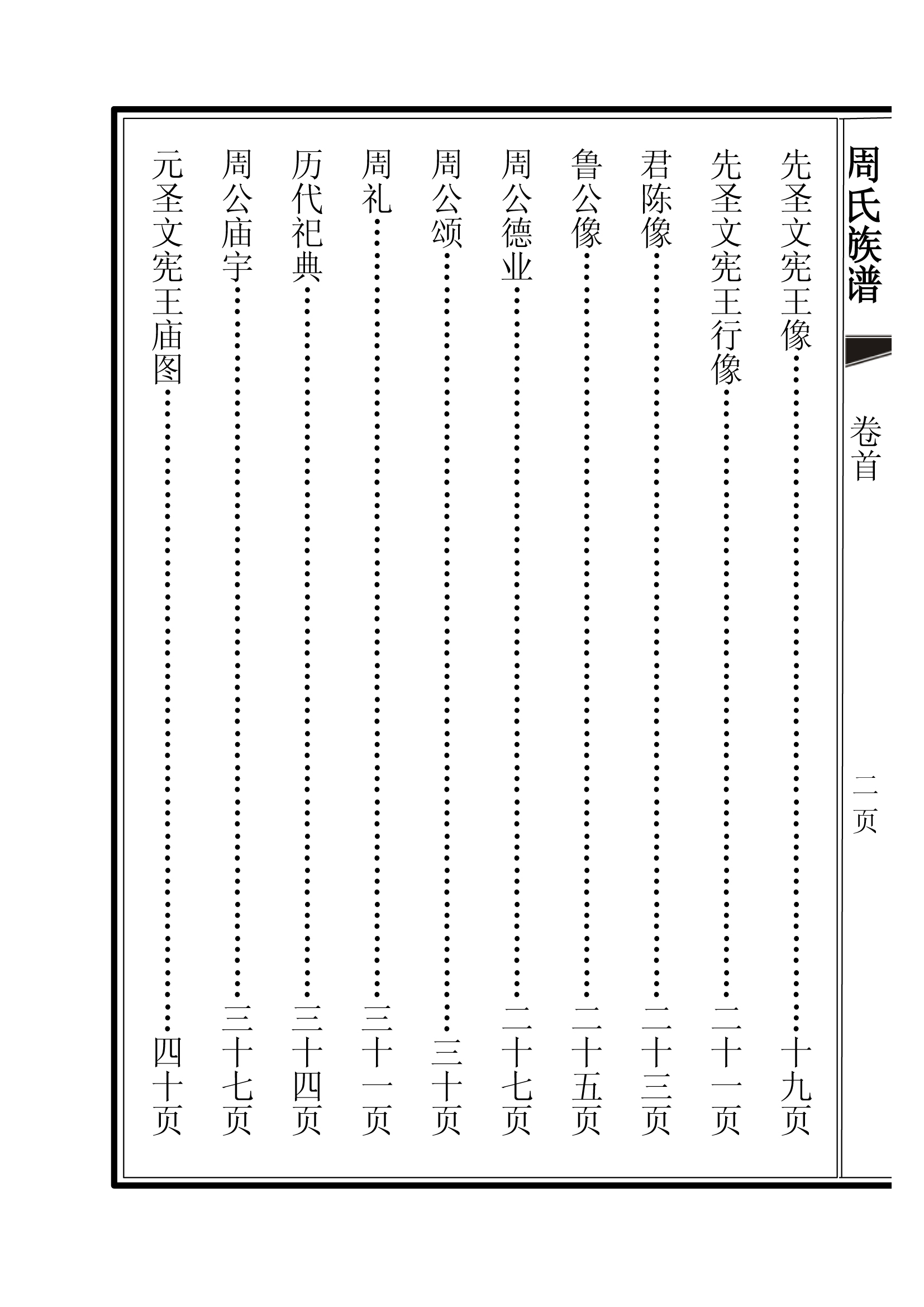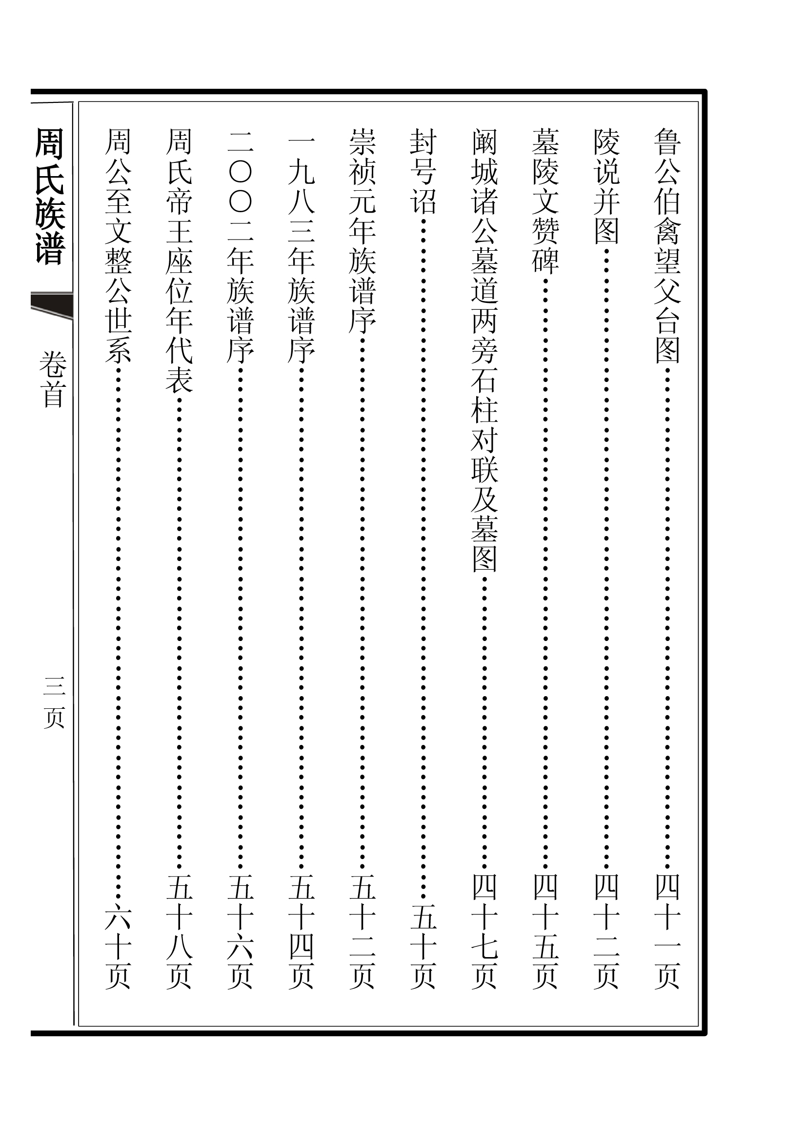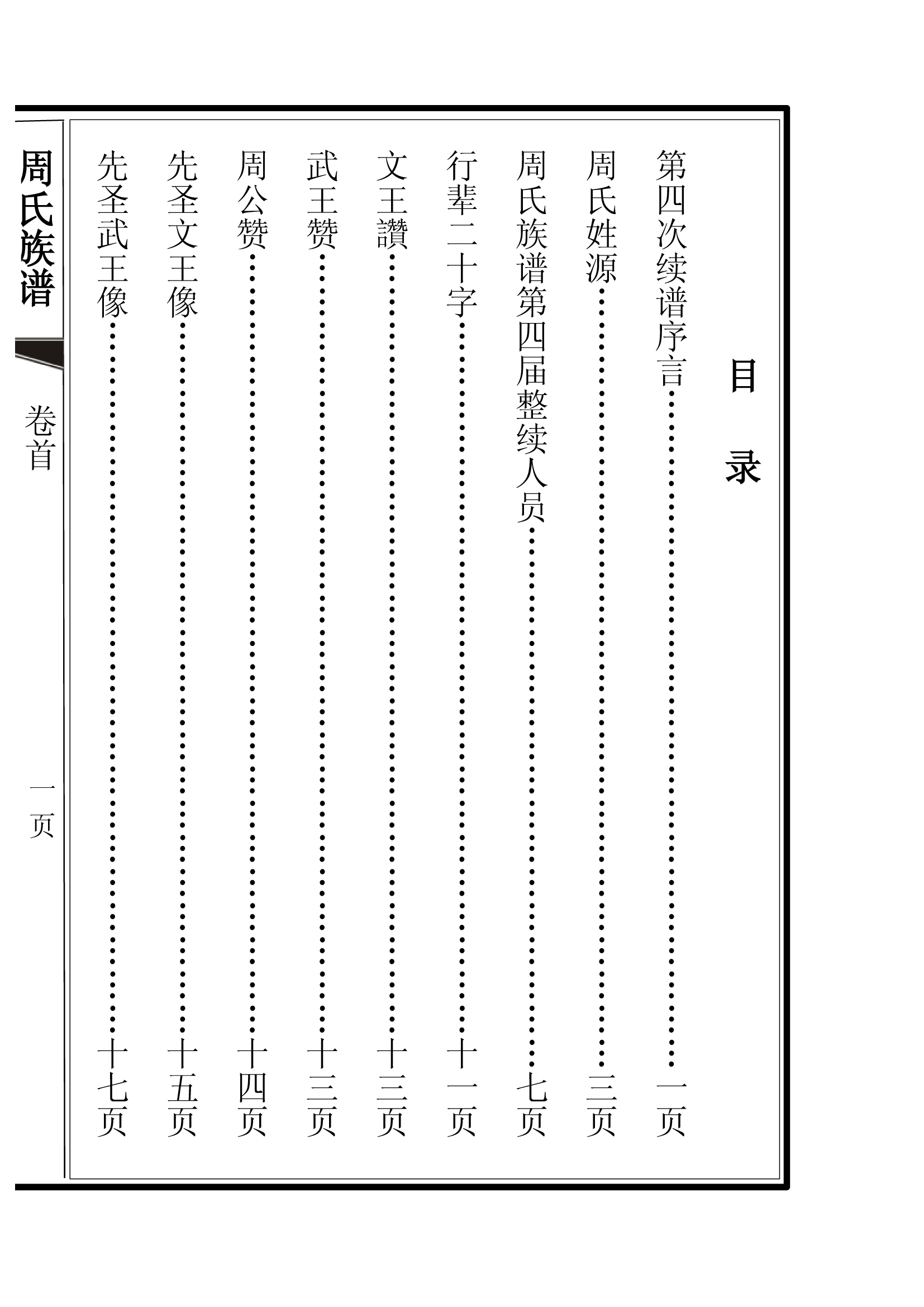 族众分布于牡丹区周集村、曹县楼庄祥符寨、兰考周庄等村庄。卷首自成一卷,内容有序言、姓源、排行字、历代祖像赞、历代祀典、庙图墓图、周公世系等。一至六卷为周氏世系,分支分村记录世系,世系采用吊线图格式,每图10代,只记录生子与配偶信息,每图第一代与最末代有上下链接页码。体现北方入谱内容简单,世系清楚易查的特点。字体用宋体,简明而古朴。...