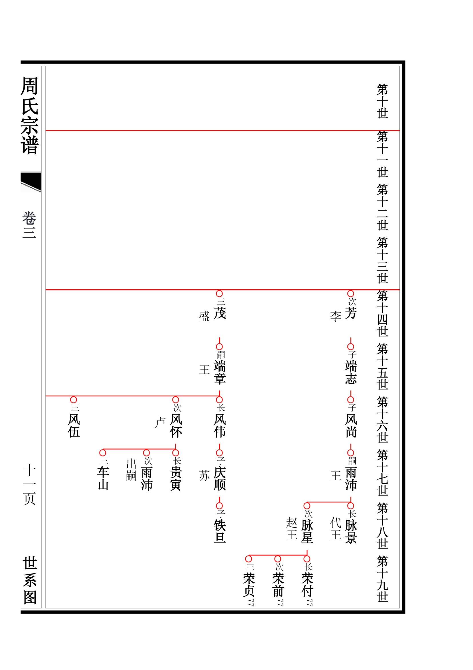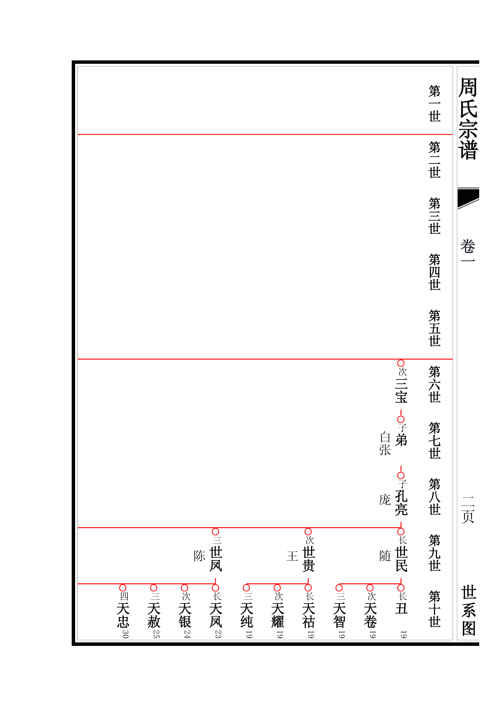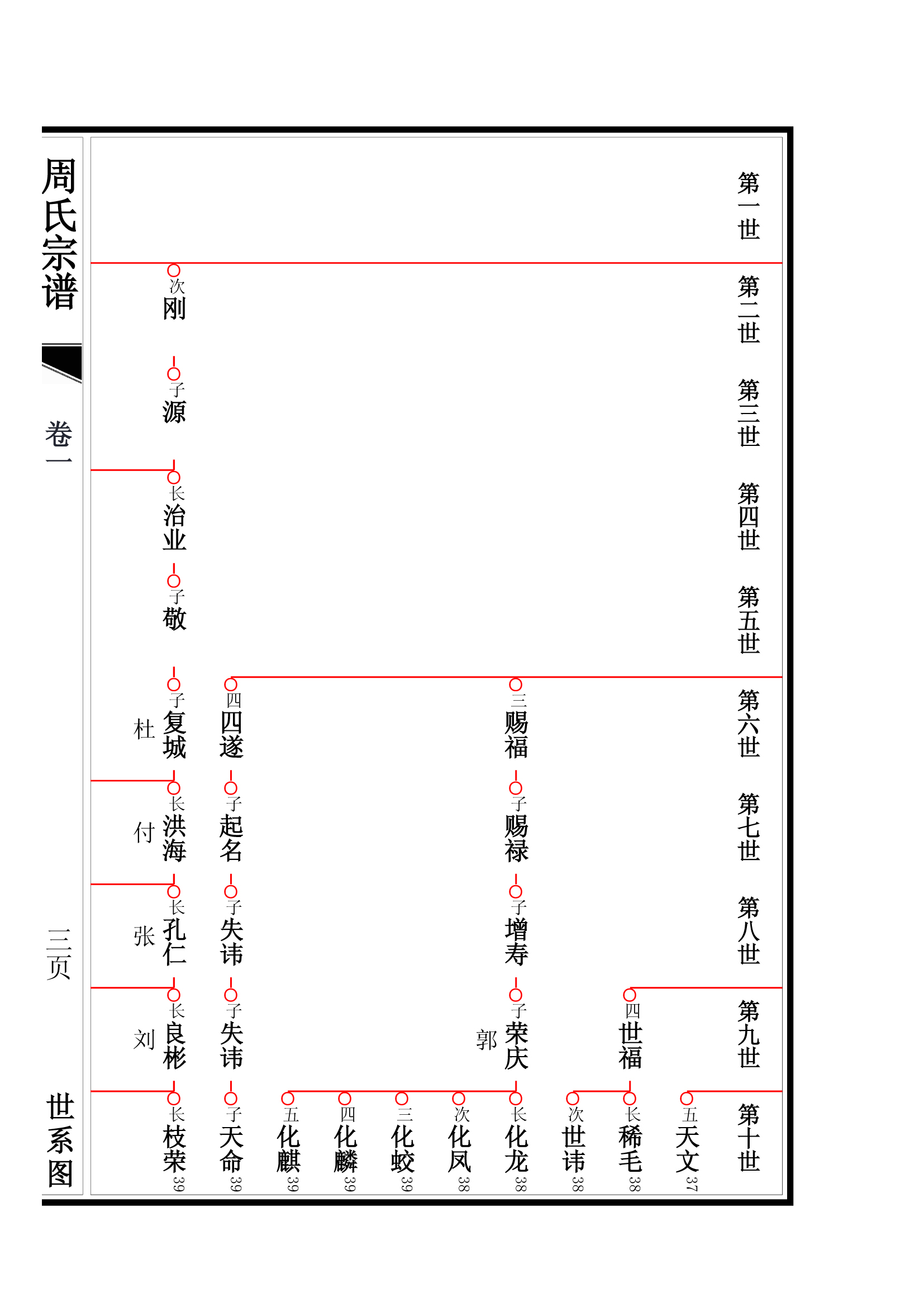 族众分布于牡丹区周集村、曹县楼庄祥符寨、兰考周庄等村庄。卷首自成一卷,内容有序言、姓源、排行字、历代祖像赞、历代祀典、庙图墓图、周公世系等。一至六卷为周氏世系,分支分村记录世系,世系采用吊线图格式,每图10代,只记录生子与配偶信息,每图第一代与最末代有上下链接页码。体现北方入谱内容简单,世系清楚易查的特点。字体用宋体,简明而古朴。...