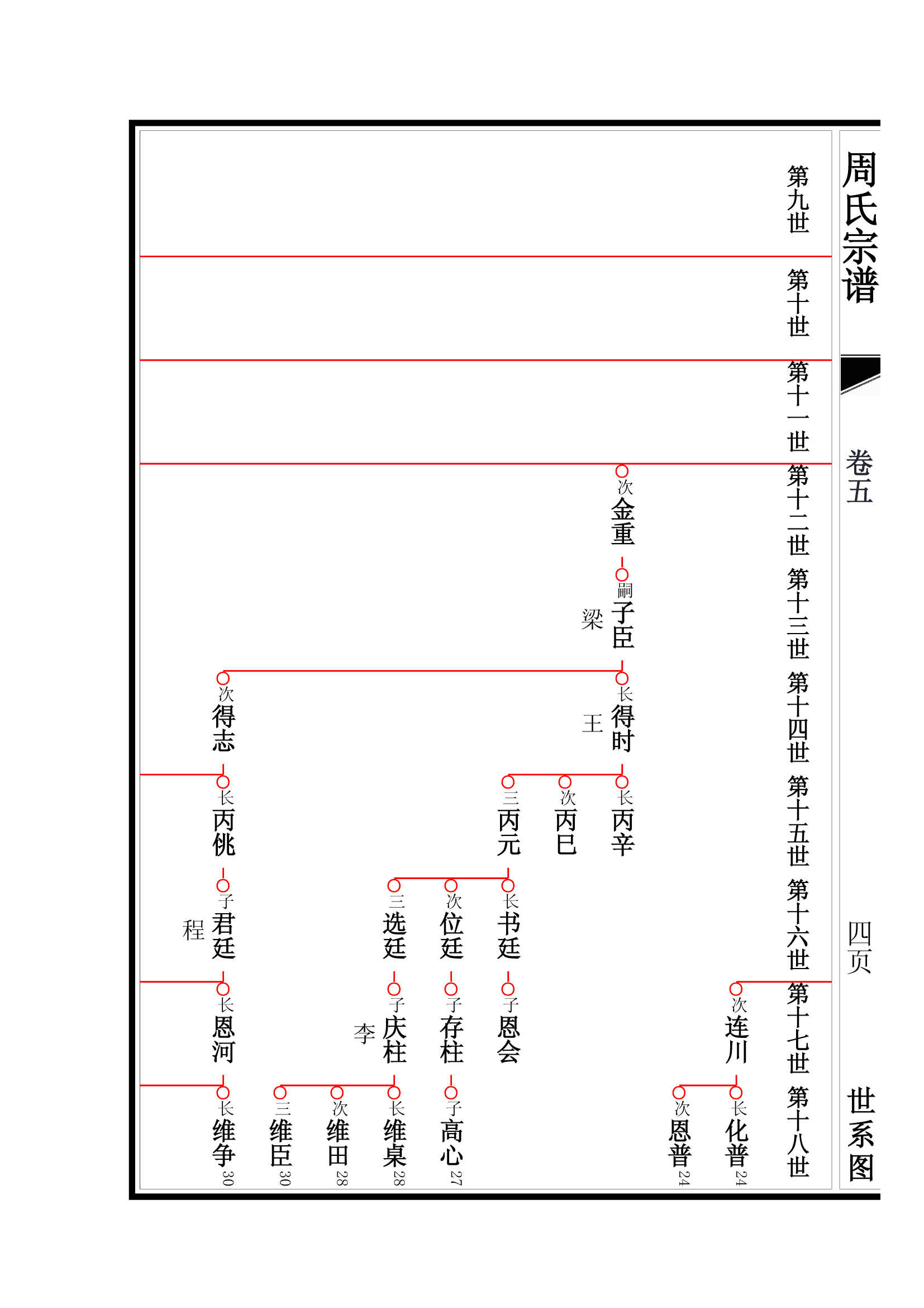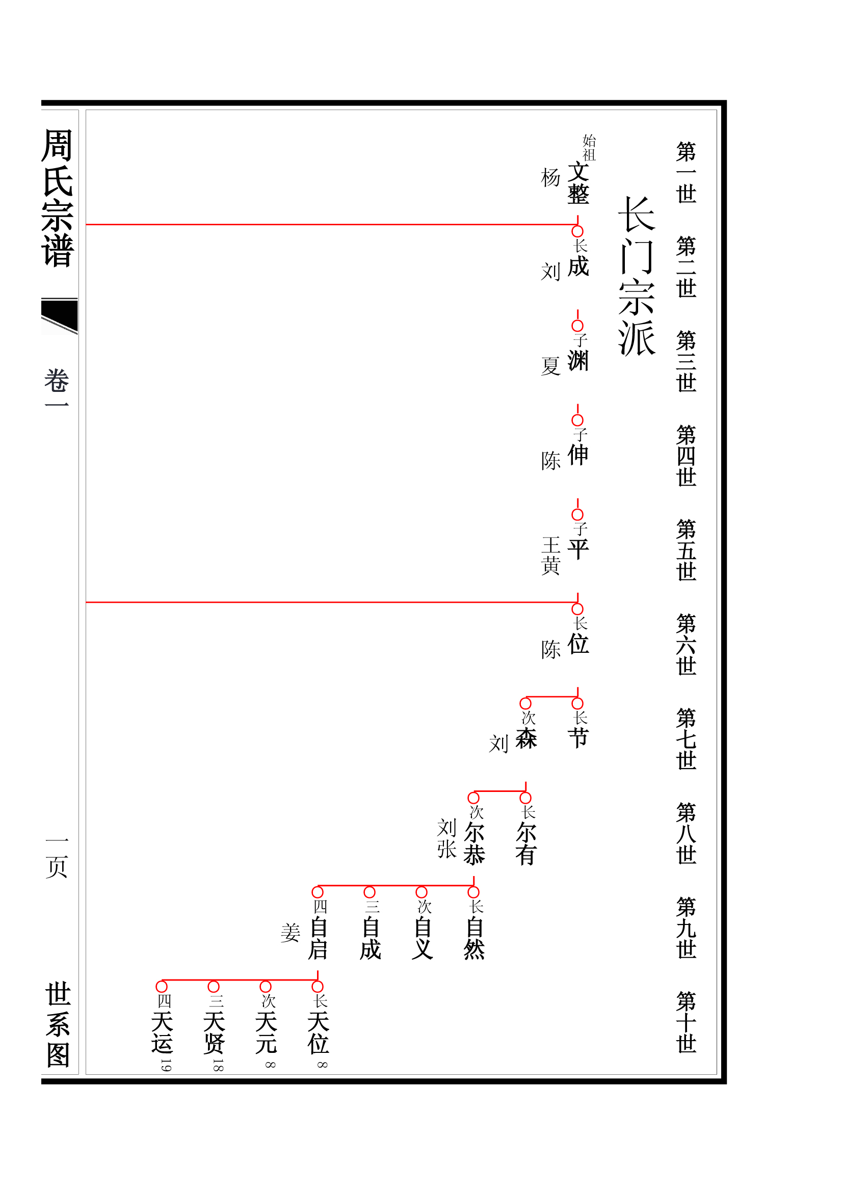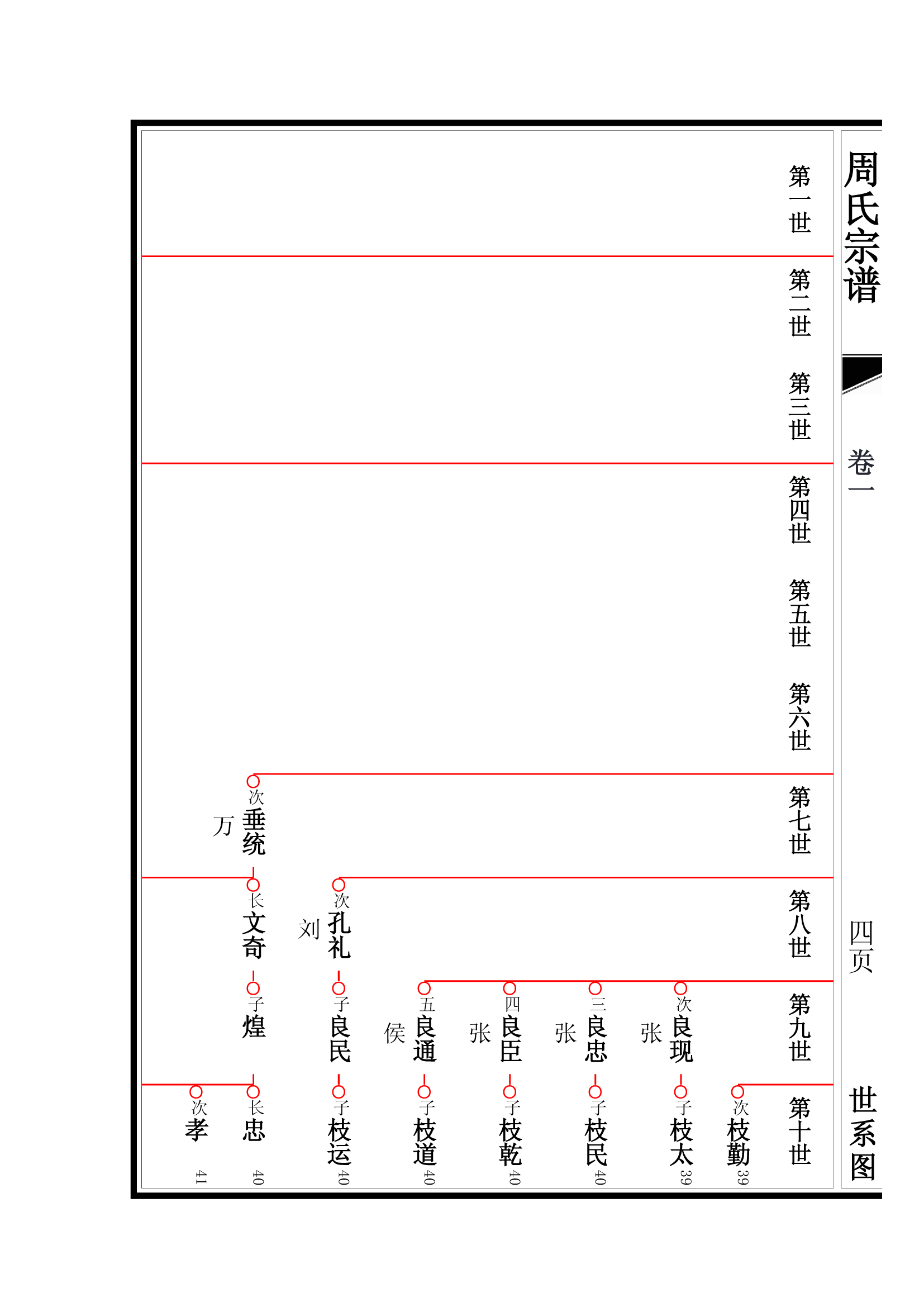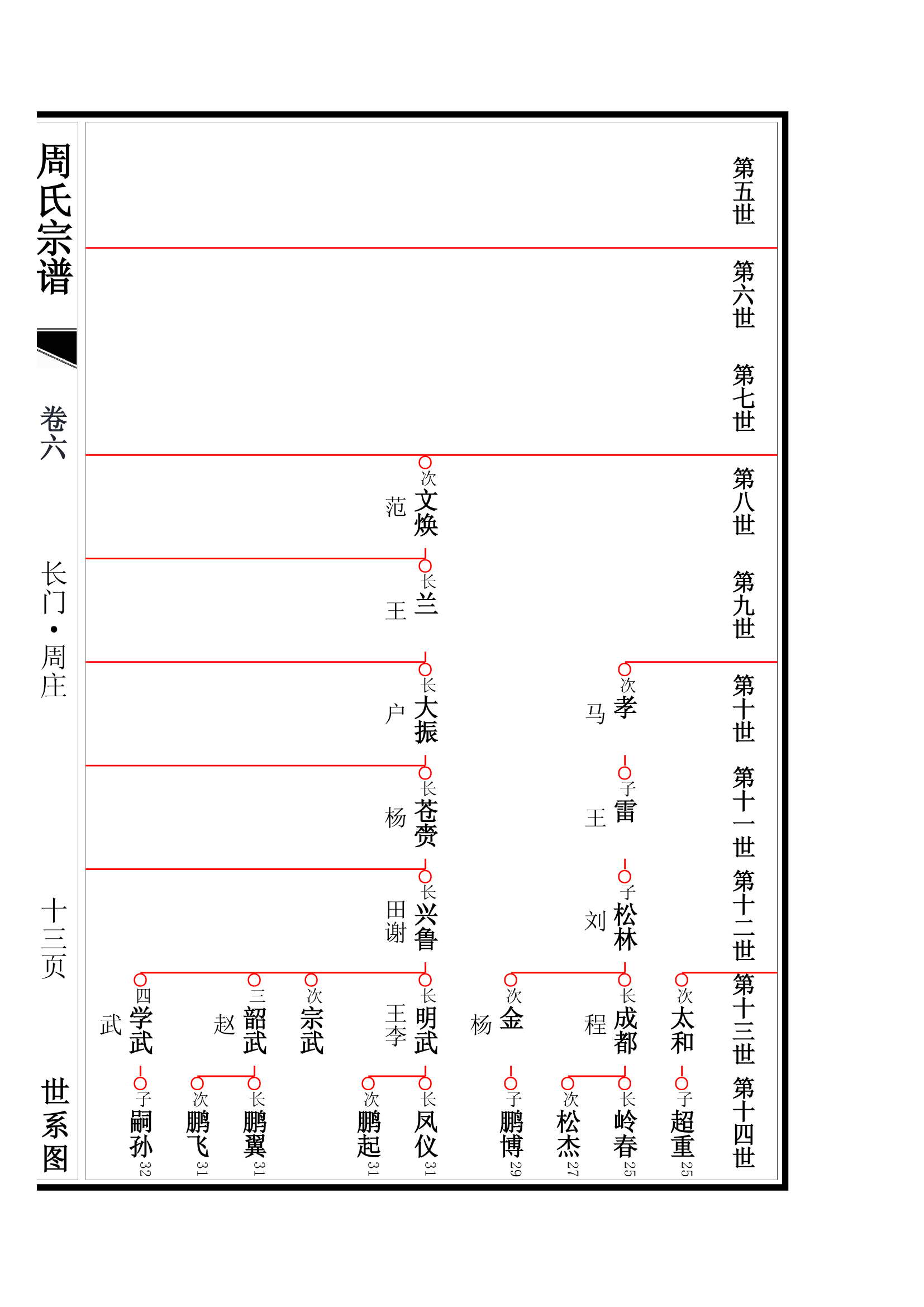 族众分布于牡丹区周集村、曹县楼庄祥符寨、兰考周庄等村庄。卷首自成一卷,内容有序言、姓源、排行字、历代祖像赞、历代祀典、庙图墓图、周公世系等。一至六卷为周氏世系,分支分村记录世系,世系采用吊线图格式,每图10代,只记录生子与配偶信息,每图第一代与最末代有上下链接页码。体现北方入谱内容简单,世系清楚易查的特点。字体用宋体,简明而古朴。...